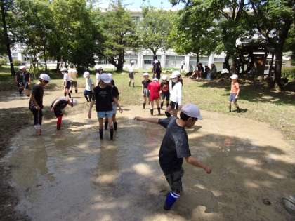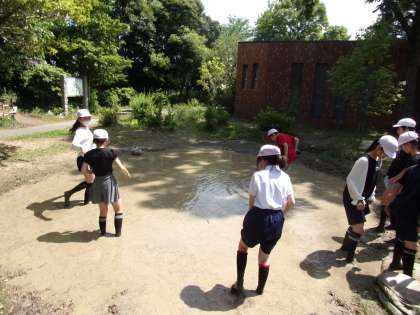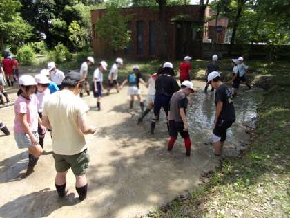 土と水を混ぜ、稲の苗を植えやすくしました。
