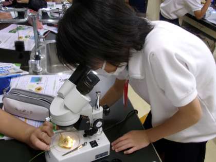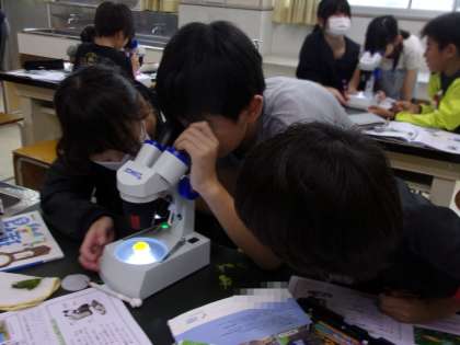 双眼実体顕微鏡では、ものが立体的に見えます。今後、メダカの卵を観察する際に使うことになるので、その使い方を練習していました。やはり、先週、5月28日(水)の授業の様子です。