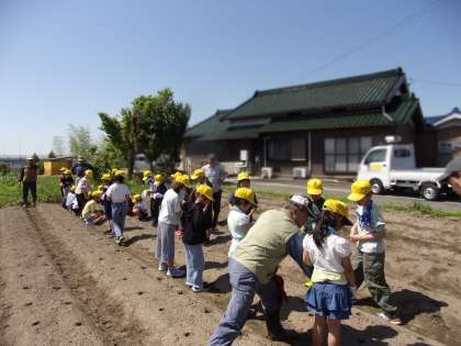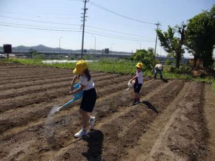 最後に、代表の子が、じょうろを使って、それぞれの種がまかれた場所に、入念に水やりをしました。