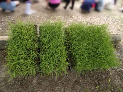 6日(金)、延期していた田植えが行われました。今年の苗は、5年生が種籾から育てた苗です。