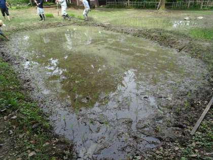 田植え終了後の田んぼの様子です。最後の最後に、講師の方々が確認作業をされ、田植え完了となりました。大変お世話になり、ありがとうございました。