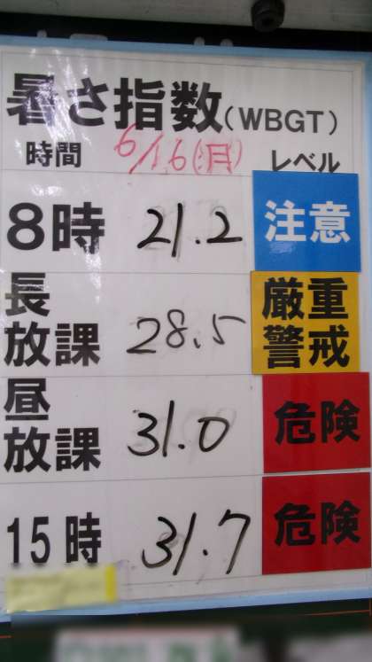 天気予報通り、今日は気温が上がりました。熱中症指数(WBGT)も上がりました。そして、今年度初めて、屋外での活動を制限することになりました。