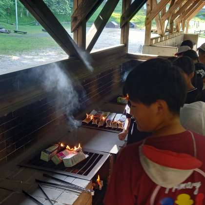 牛乳パックに材料を入れ、火にかけて作ります。