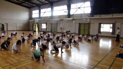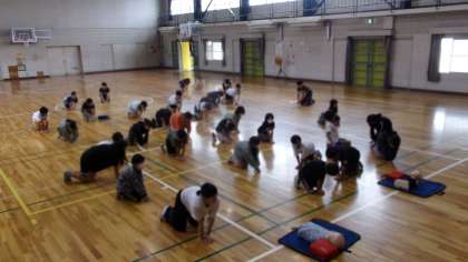 まずは、心肺蘇生の重要性について、お話を聞き、胸骨圧迫(心臓マッサージ)のやり方を学びました。手の構え方や自分の体勢、胸骨を押すリズムなどを、一斉に練習しました。