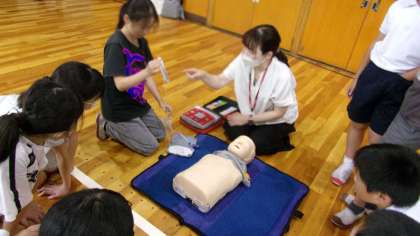 続いて、AEDの使い方を学びました。グループで1名が代表として、練習用AEDを扱い、その他の子がその様子を見て学びました。