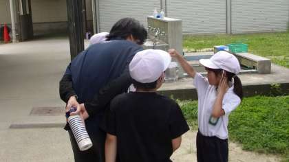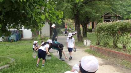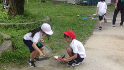 2年生は、ビオトープなどで生き物を見つけ、教室でお世話をしています。これは、17日(火)、3クラス合同で、生きものを探しているときの様子です。