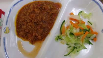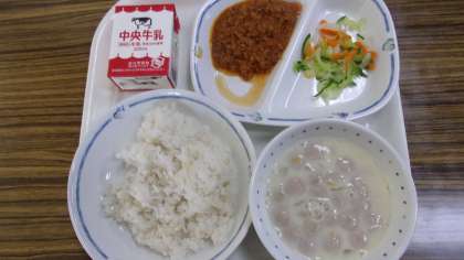 タコライスは、たぶん、本校給食史上、初めての登場でしょう。仕切り皿の左側がソース、右側が野菜で、その両方をご飯にかけて食べました。ちなみに、主菜は、「まめまめまめのスープ」でした。確かに豆が入っていましたが、沈んでいるので、写真からはわからないかもしれません。たくさん浮いているのは豆ではなく、ソーセージです。