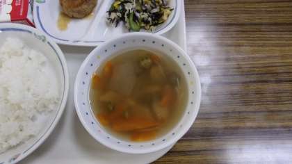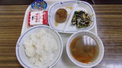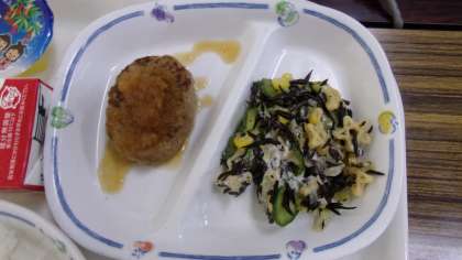 主菜は、「天の川汁」でした。そうめんやオクラが入っていました。仕切り皿の右側は、「七夕サラダ」でした。星型のパスタ(マカロニ?)が入っていました。さらに、「星型パインゼリー」もつきました。七夕に関連したメニューが、見事なまでに並びました。