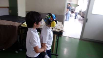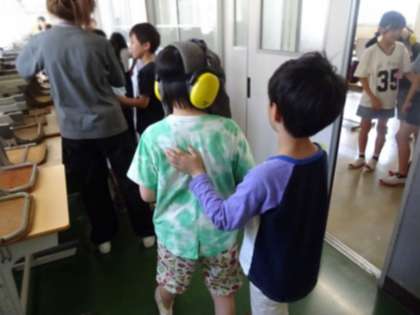 廊下を歩く様子です。平坦な廊下を歩くだけですが、不安そうです。経験する子と介助する子がペアとなって行っていました。