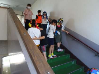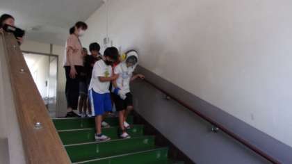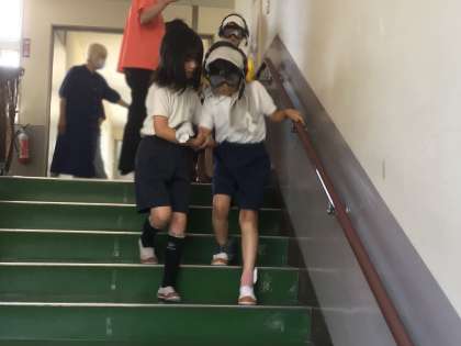 疑似体験する子と介助者役となる子の位置が、それぞれ少しずつ違っています。一人一人が試行錯誤していることが伝わってきます。