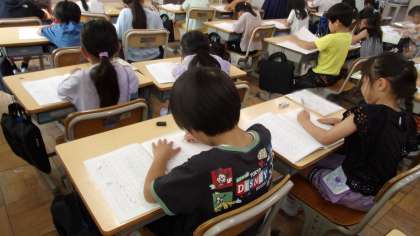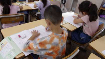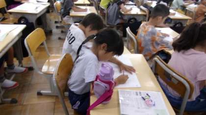 マスがある用紙に縦書きで書きます。みんな一生懸命書いていました。8日(火)の授業の様子です。