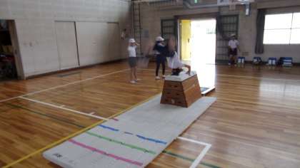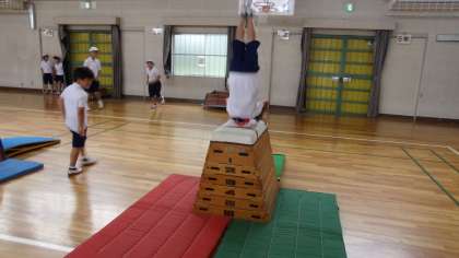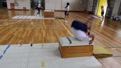 台上前転・伸しつ台上前転・頭はね跳びの練習をしていました。4日(月)、授業研究として行いました。