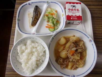 給食「肉じゃが・いわしの梅煮・塩こうじ和え」