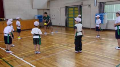 7日(月)、豊田市をホームとするラグビーチーム、トヨタヴェルブリッツの3選手にお越しいただき、 タグラグビー講座が行われました。