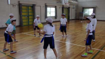 あいさつをした後、輪になって、パス練習を行いました。
