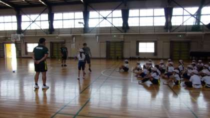 続いて、タグラグビーならではのルール、タグをとる練習をしました。そして、試合のルールを確認しました。