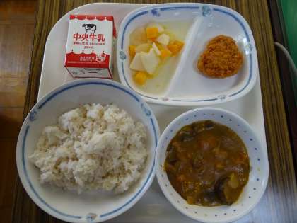 キムチチャーハンに続く、9月2回目の給食は、人気メニューのカレーでした。今回は、ナスなどの入った「夏野菜のカレー」で、「ヒレカツ」を入れると「夏野菜のかつカレー」にできます。何と、豪華なメニューでしょう。