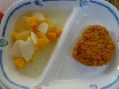 給食「夏野菜のカレー・ヒレカツ・なしポンチ」