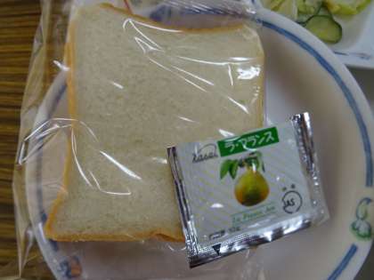 主菜は「大麦と野菜のスープ」で、副菜に「コーンサラダ」「チキンナゲット」がつきました。スライスパンには、ラ・フランスのジャムを塗って食べました。