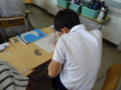 合同な三角形を描くには、どうしたらよいのでしょうか?みんなでチャレンジし、この授業内で、全員が描けるようになることを目指していました。