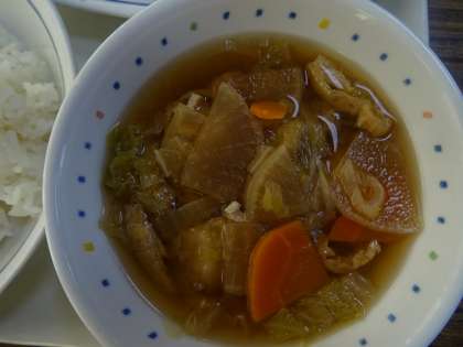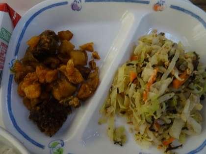 給食「レバーとジャガイモの甘辛煮・海老団子汁」