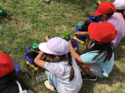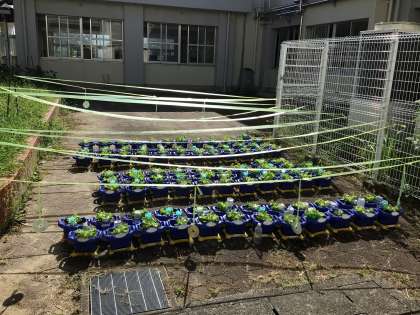 それぞれクラスごとに行いましたが、植えた苗は、1か所に固めました。速やかに鳥よけをして育てています。