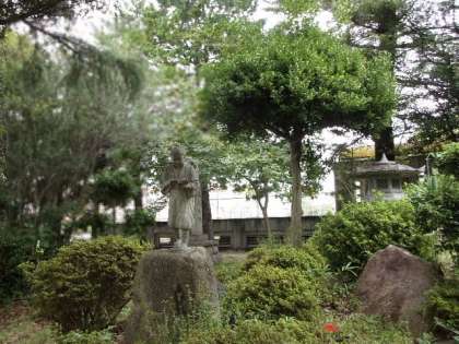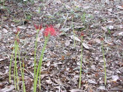 ようやく、ヒガンバナが開花しました。今日確認できたのは、この写真の2輪です。3枚目の写真は、1枚目の花を、二宮金次郎像と一緒に撮ってみた写真です。