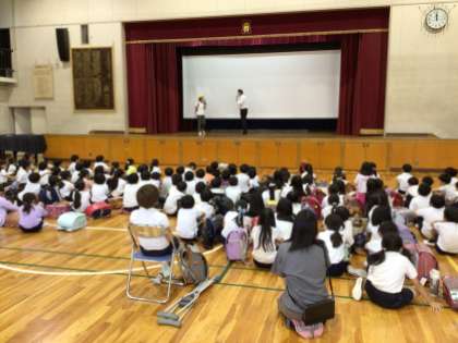 防犯教室は、3年生でも行いました。これらの写真は、不審者に声をかけられたときに、どうやって対応するかを考える寸劇です。お二人が、とても名演技で、子どもたちは引き込まれていました。