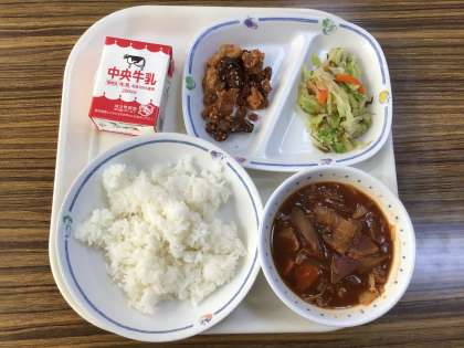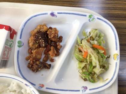 給食「キムチ入り味噌汁・レバーと大豆のごまがらめ」