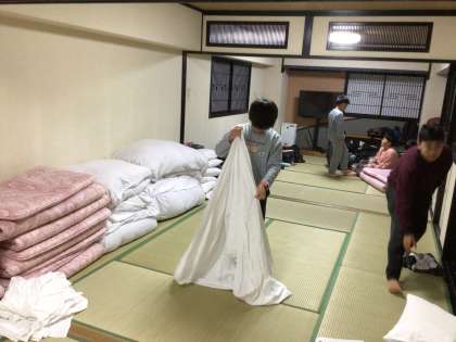 起床時刻となり、寝具の片付けや朝の支度が始まりました。