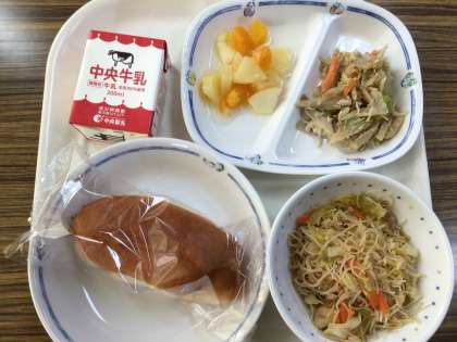 こんな感じでした。ビーフンまたは焼きそば、米粉パン、フルーツ…という組み合わせは、給食では結構よくある組み合わせです。