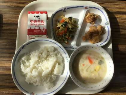 給食「豆乳のバランス味噌汁、鶏肉のおろしソースかけ」