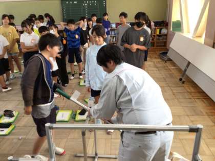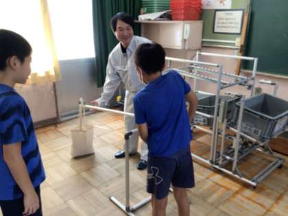 てこについて、実際に動かしながら、その仕組みを実感しているところです。