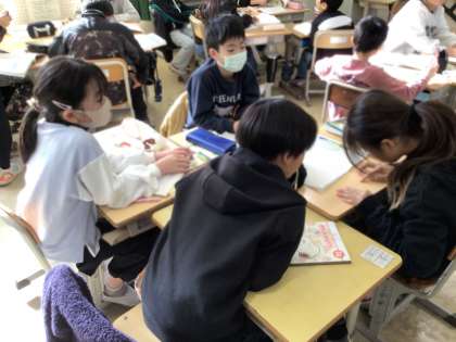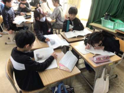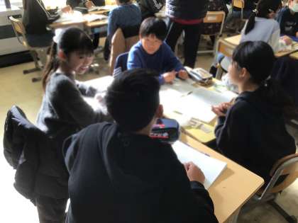 疑問に思ったことについて、グループで話し合っていました。真っ向勝負を繰り広げる、大造じいさんと残雪の心情に迫っていきたいところです。