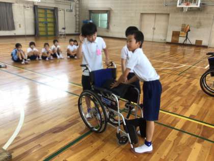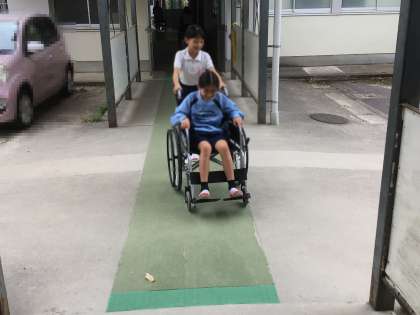 車いすは、2〜3人で組となり、乗り手と介助者を交代しながら行いました。