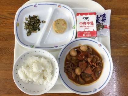 給食には、七草粥ではなく、「七草ごはん」が登場しました。仕切り皿の左側にある野菜が「七草ごはんの具」です。これを、ごはんに混ぜて食べました。