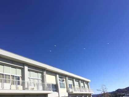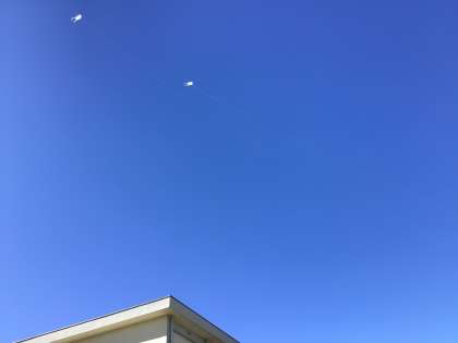 子どもたちのなかには、とても高いところまで凧を上げている子もいました。せっかくなので、真っ青な冬場れの空に上がった白い凧を撮影してみました。