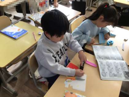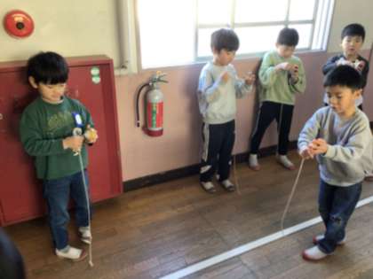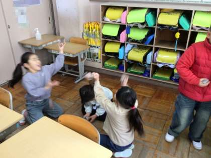 今日行われた、「昔遊びの会」に先立ち、先週、1年生は各教室で、昔遊びを体験しました。これらの写真は、1組の様子です。この時は、まだ、誰にも教えてもらえないので、なかなかすんなりとはいきませんでした。
