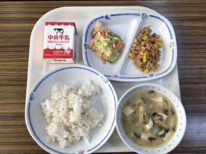 給食「ツナそぼろ丼・豆腐とわかめの味噌汁」