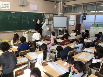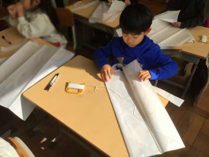 凧に絵を描きました。これらは、先週の学習の様子で、今週、できあがった凧で遊びました。