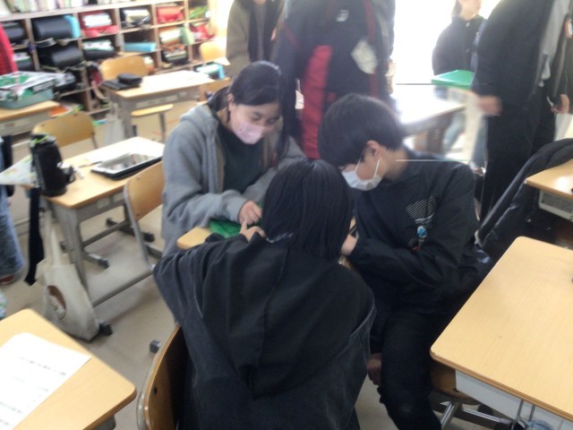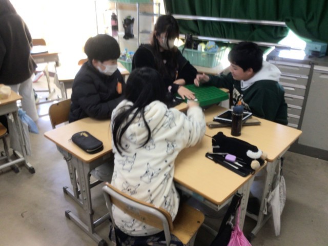 視覚障がいがあっても遊べるようにできているオセロゲームを体験していました。福祉委員会のアルミ缶・牛乳パック回収で得た収益で今年購入したものです。まずは、全校で順番に回して、全員が体験しています。