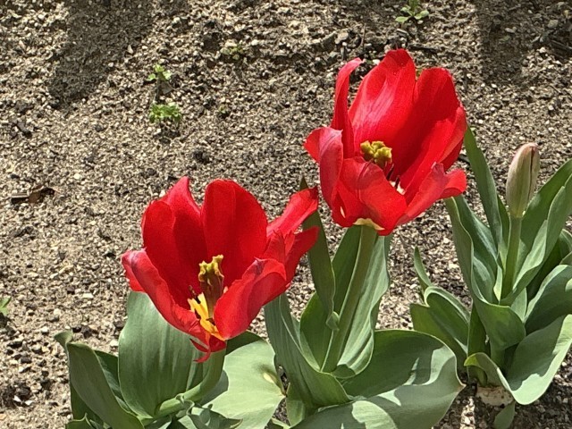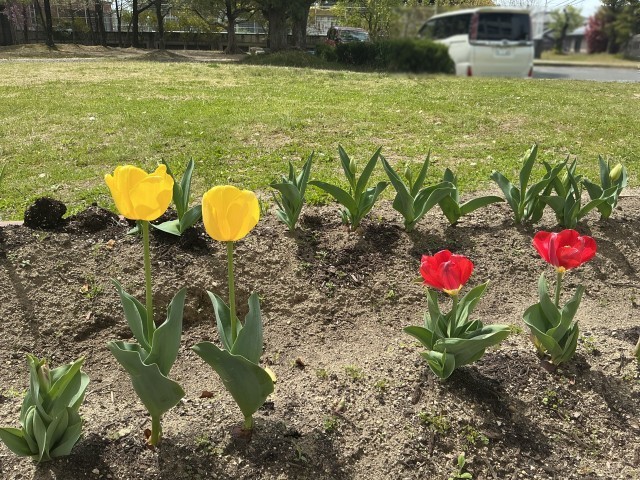 昨年度の環境美化委員が球根を植え、手入れをしてきたチューリップ、今、どんどん花が開いています。