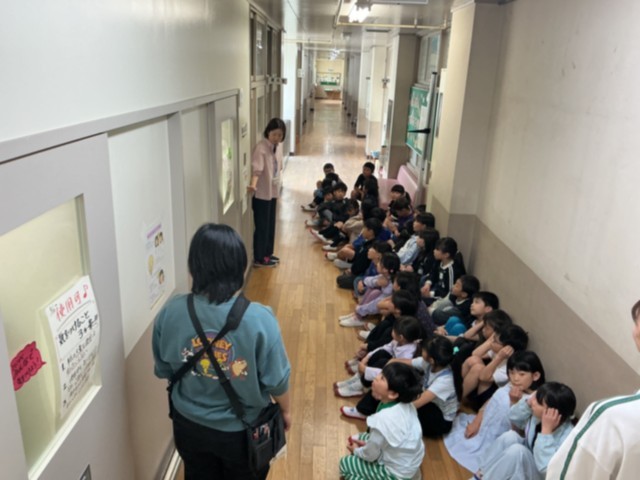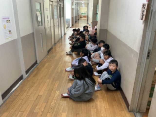 3年生の聴力検査の様子です。放送室で行うため、その前の廊下で、説明を聞きます。また、聴力の検査ですので、廊下で静かに待っている必要があります。写真は、説明を聞いたり、静かに待っている3年生の様子です。上の写真から、1組、3組、2組です。