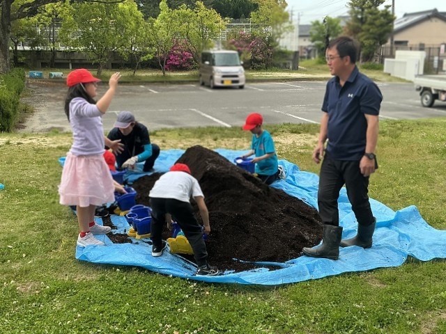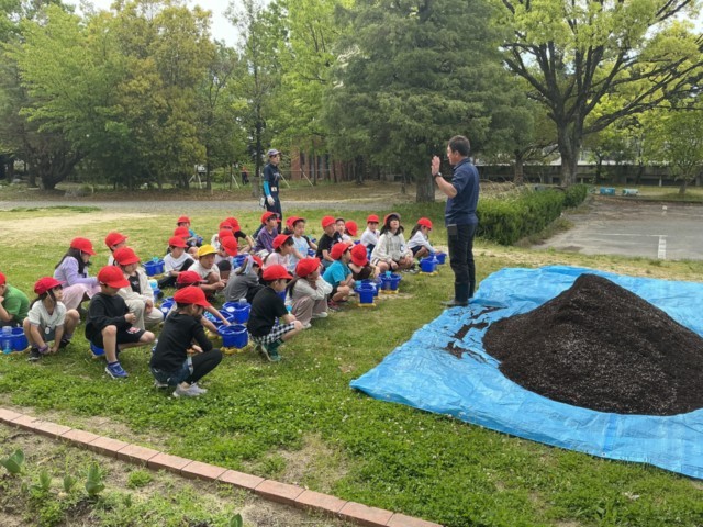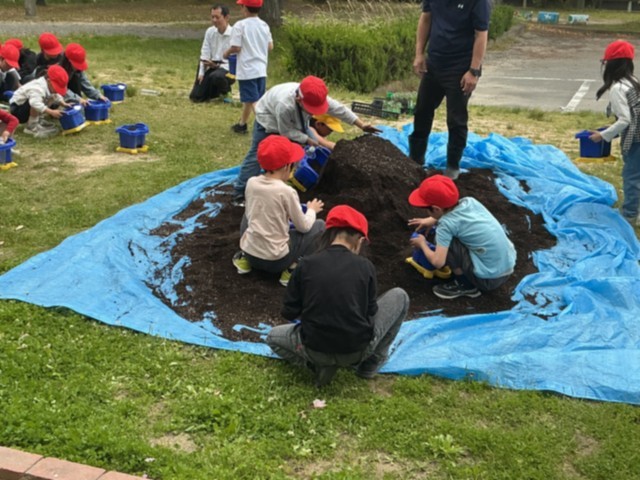 続いて、2年生が苗植えをしました。まずは、説明を聞き、植木鉢に土を入れていきます。