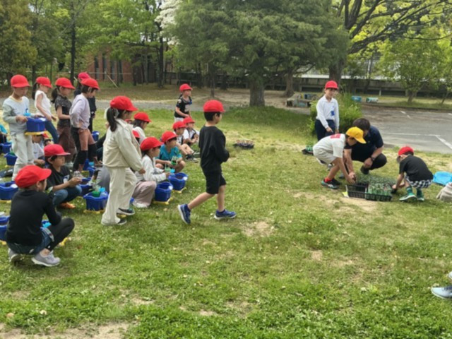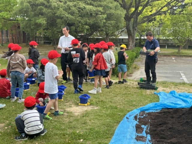 次に、苗を受け取って、その苗をポットから抜き、植木鉢に植えていきました。子どもたちにとっては、結構緊張する作業だったと思います。苗は、ピーマン・トマトなどから、自分で選んだとのことです。