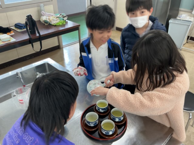 急須を使って、お茶を入れました。今や、お茶はペットボトル…というご家庭も多いのではないかと思いますから、もしかしたら、こんなこと、初めてやった…どころか、初めてLiveで見た…なんて子もいたかもしれません。21日(火)の授業の様子です。