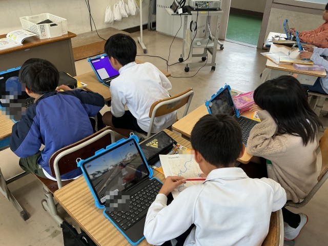 手元の地図と学習用タブレットのストリートビューを見比べていました。それぞれに、それぞれの良さがあります。