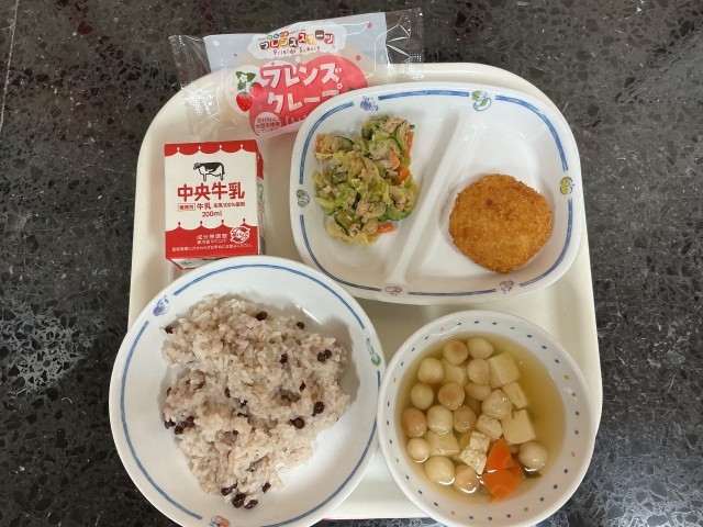 赤飯、麩玉汁、海老かつ、デザート…と「祝い」らしいメニューが並びました。なお、こ...