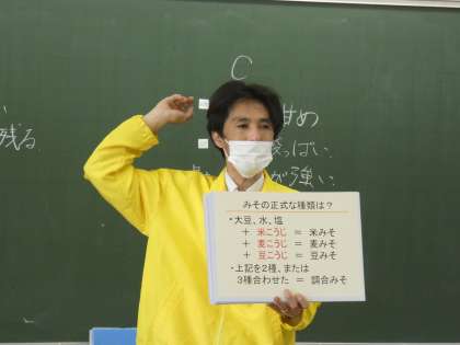 6年生は、総合的な学習の時間の一環として、野田味噌商店の方に来ていただき、味噌についての学習を行いました。初めに、味噌の由来について説明していただきました。その後、子どもたちは野田味噌商店に用意していただいた三種類の味噌汁を飲み、味の違いや舌ざわり、色の違いについて感じたことを発表していました。