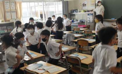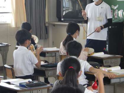音楽の授業の様子を見てみると、クラス全員が打楽器を持って、いろんなパターンのリズム打ちをしたり、曲に合わせて身体表現をしたりとそれぞれの学級で工夫して学習を進めています。